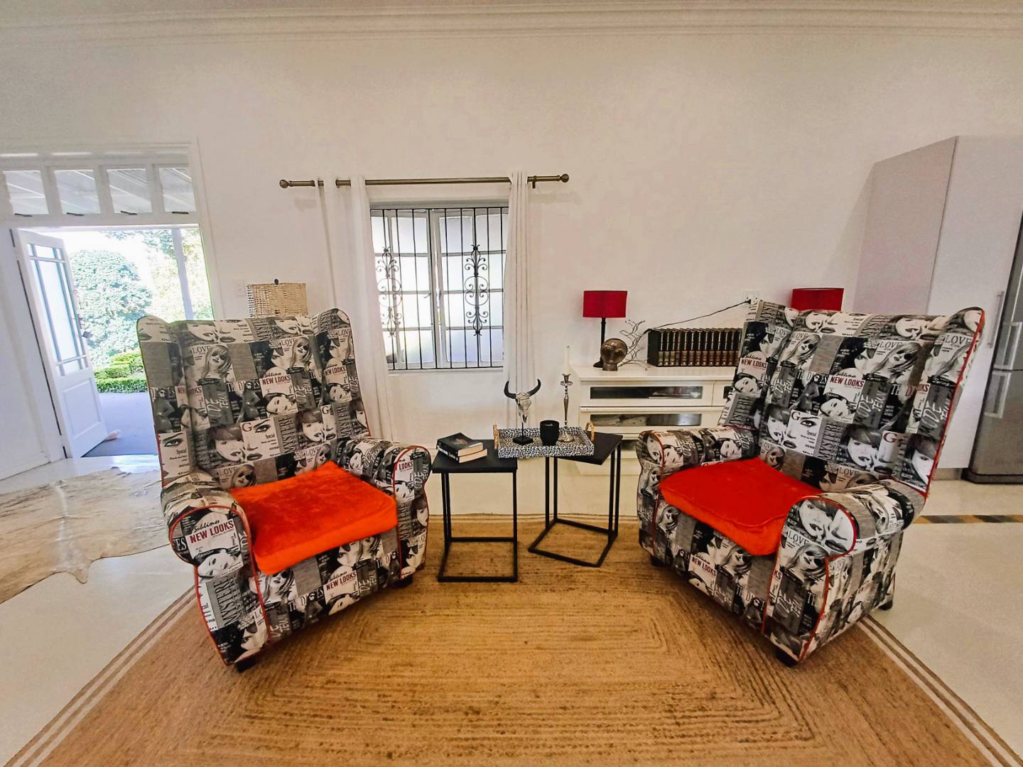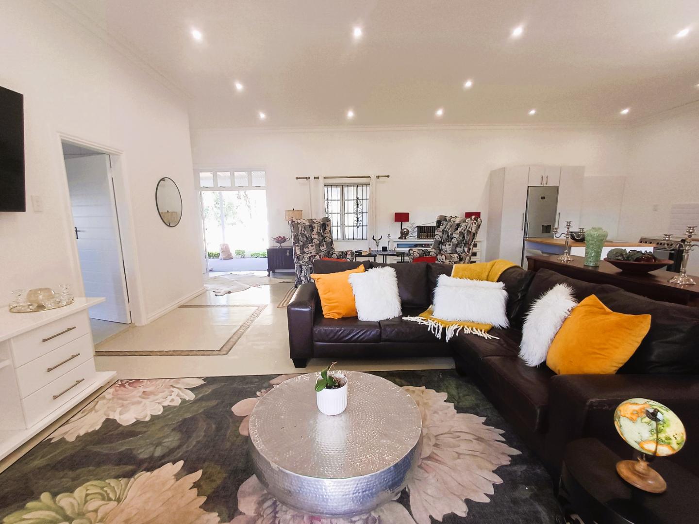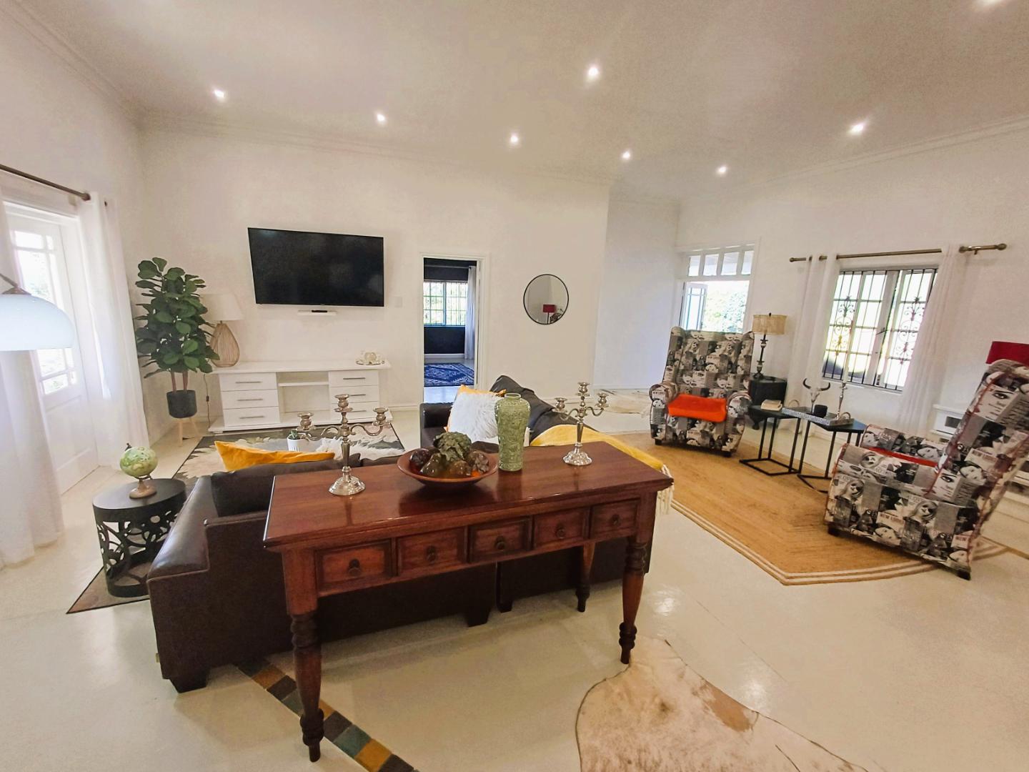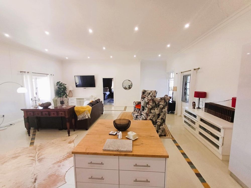 Positioned near the guard house, the unit commands spectacular views over the estate. The home's front is graced by a wide, covered patio, an ideal space for soaking in the serene surroundings. Upon entering through the double French doors, you're welcomed into a massive open-plan living area, meticulously furnished to the highest standards. This expansive space seamlessly integrates a stunning living room and a spacious kitchen. The living area, featuring two elegant highback chairs, a L-shaped leather couch, a TV mounted and additional double French doors that open onto the vast cover patio and your private entertainment area. The living area, designed for relaxation and easy conversation, flows effortlessly into the open plan kitchen.