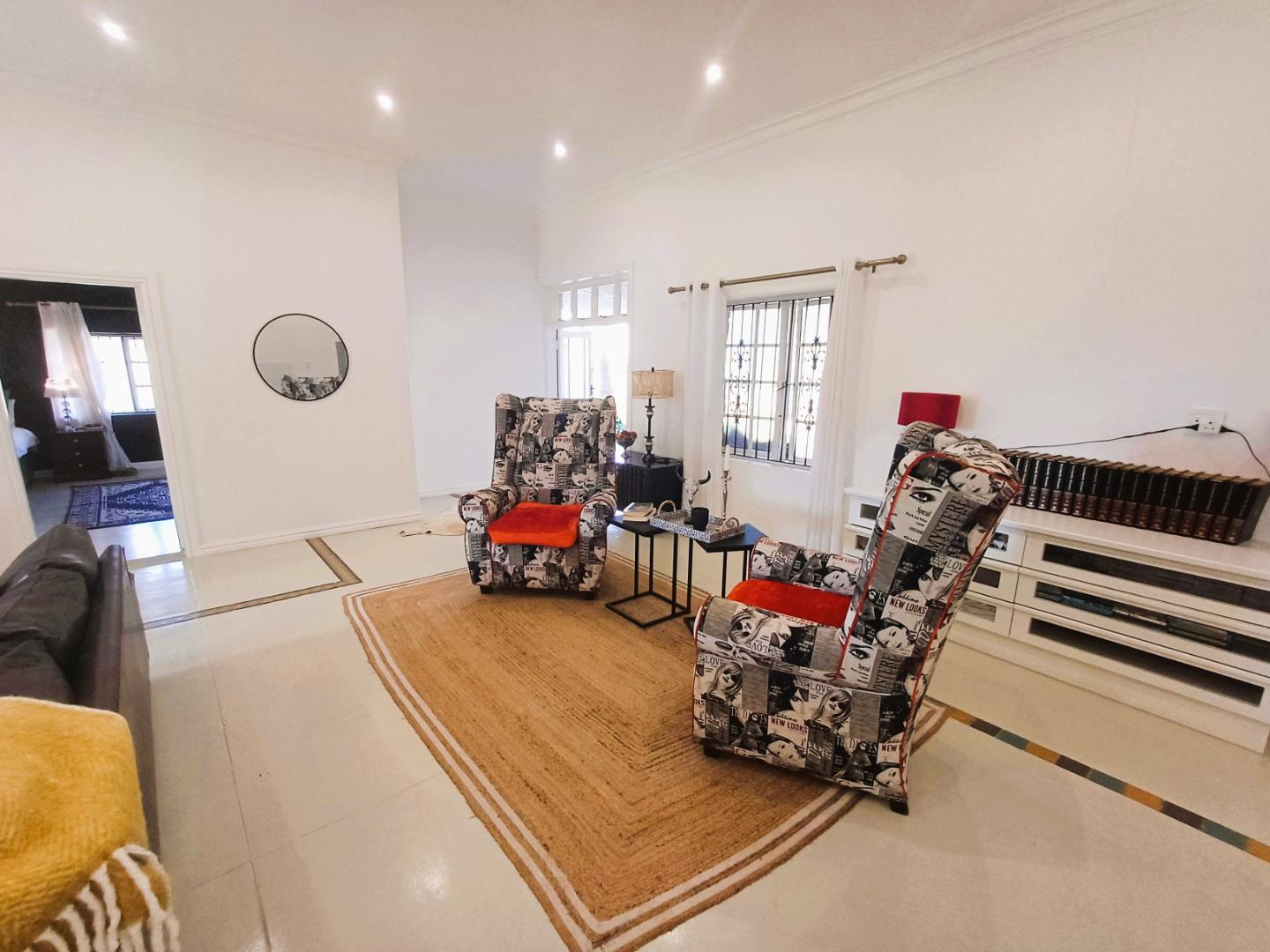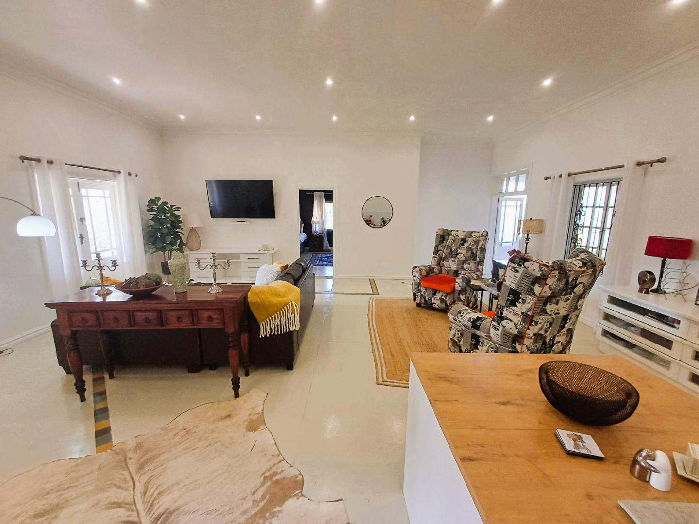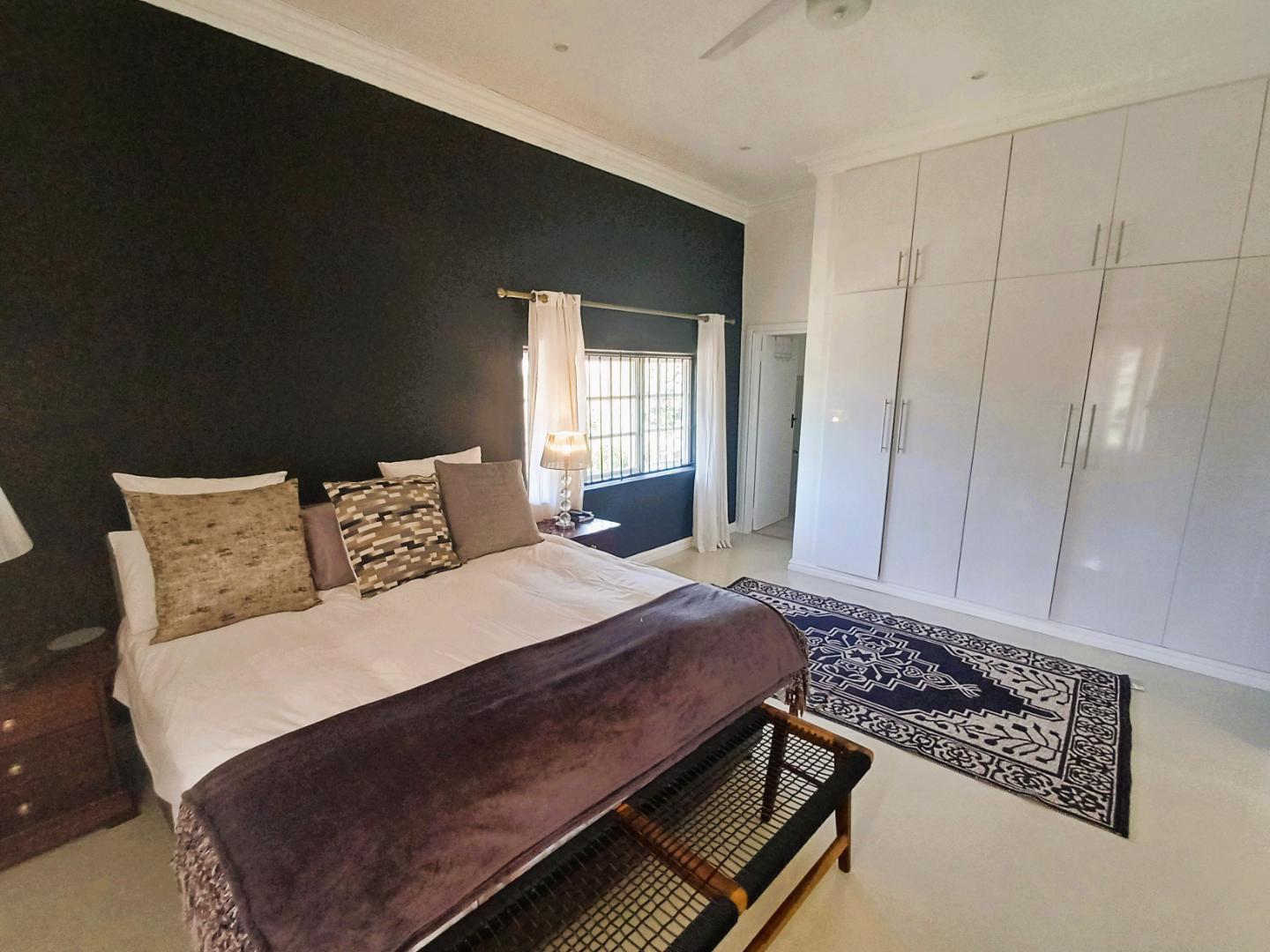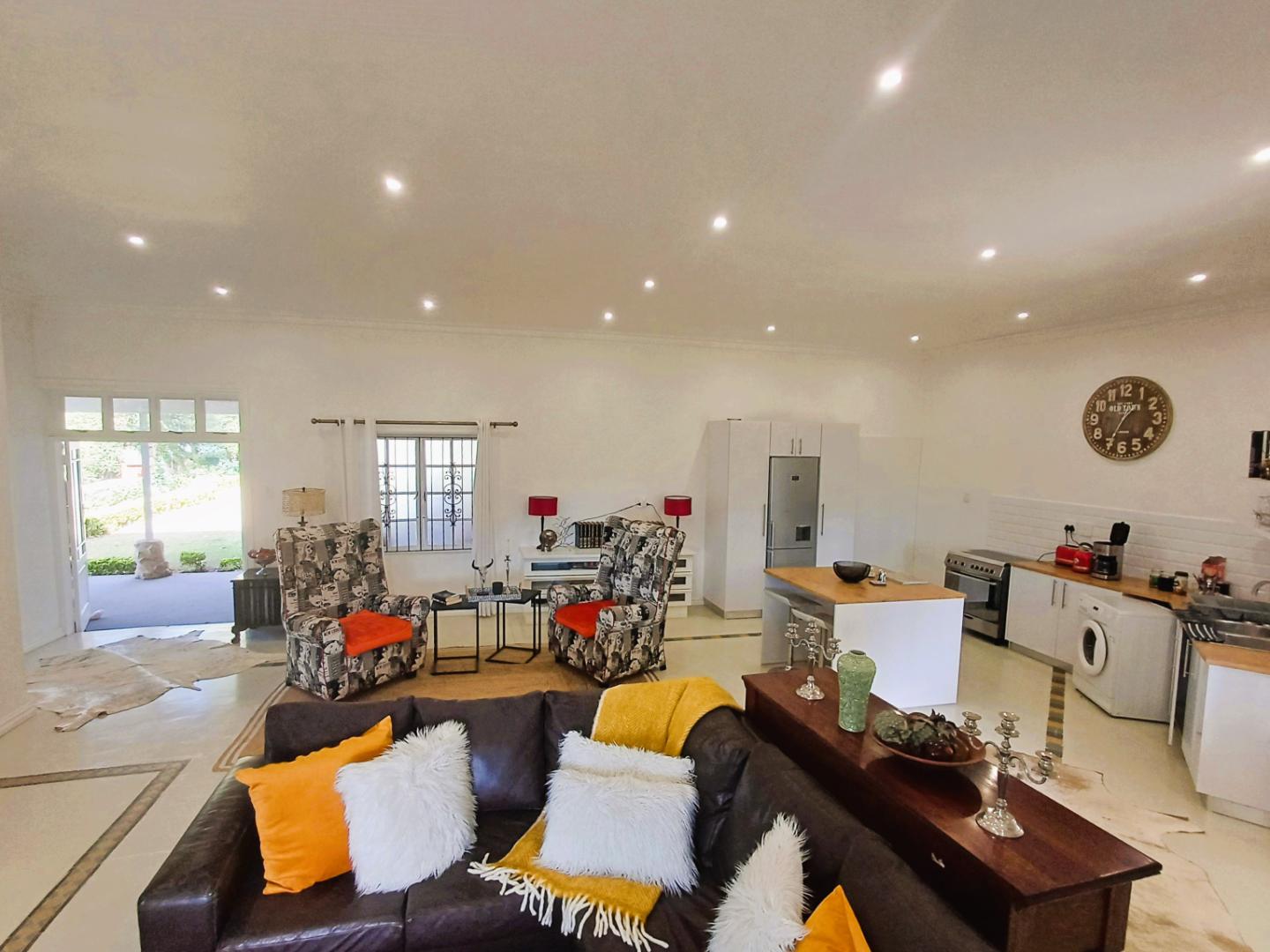 Positioned near the guard house, the unit commands spectacular views over the estate. The home's front is graced by a wide, covered patio, an ideal space for soaking in the serene surroundings. Upon entering through the double French doors, you're welcomed into a massive open-plan living area, meticulously furnished to the highest standards. This expansive space seamlessly integrates a stunning living room and a spacious kitchen. The living area, featuring two elegant highback chairs, a L-shaped leather couch, a TV mounted and additional double French doors that open onto the vast cover patio and your private entertainment area. The living area, designed for relaxation and easy conversation, flows effortlessly into the open plan kitchen.
