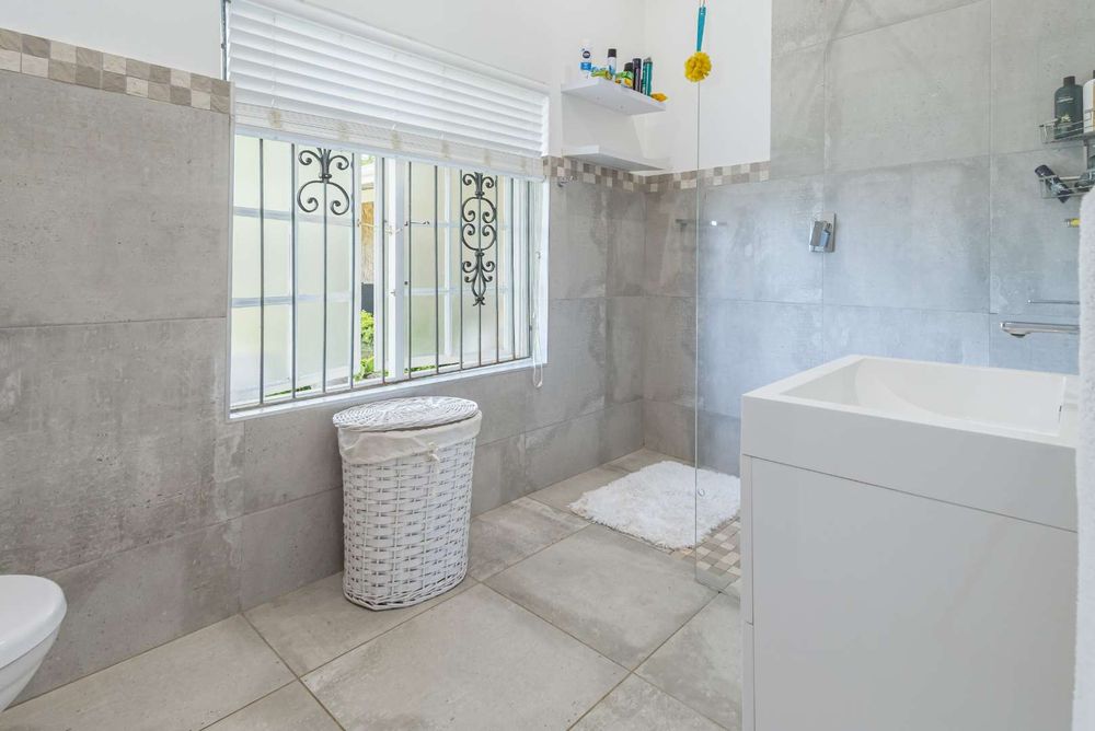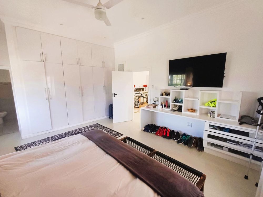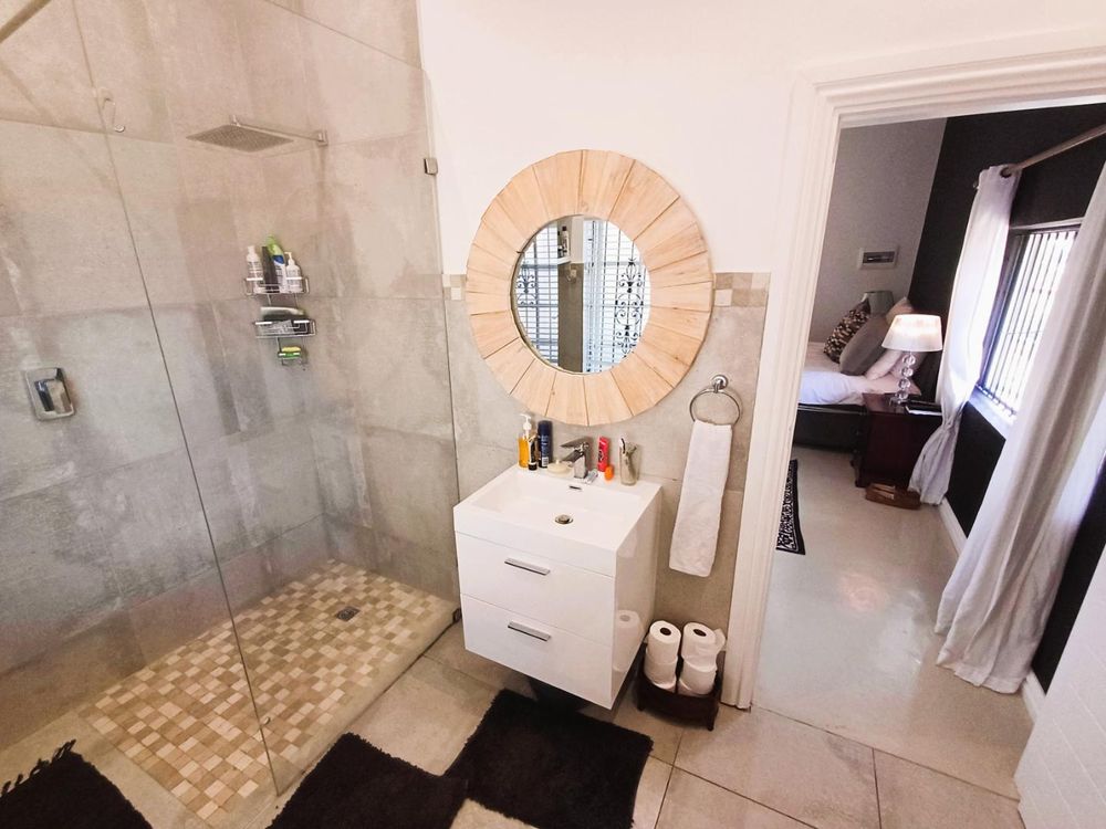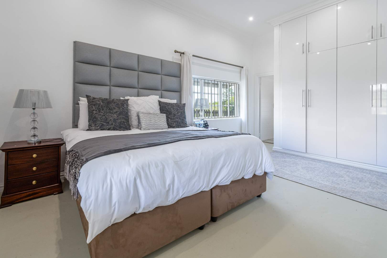 The large bedroom is furnished with a queen-size bed, mounted TV, amble cupboard space and an en suite bathroom with a walk in shower.