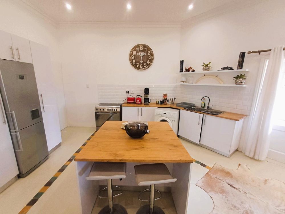 The kitchen is a chef’s paradise, offering a spacious layout with a well-appointed island unit with seating for two. This kitchen also includes a fridge, and a five-burner gas stove and a washing machine.