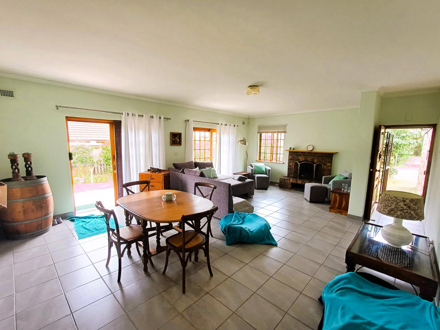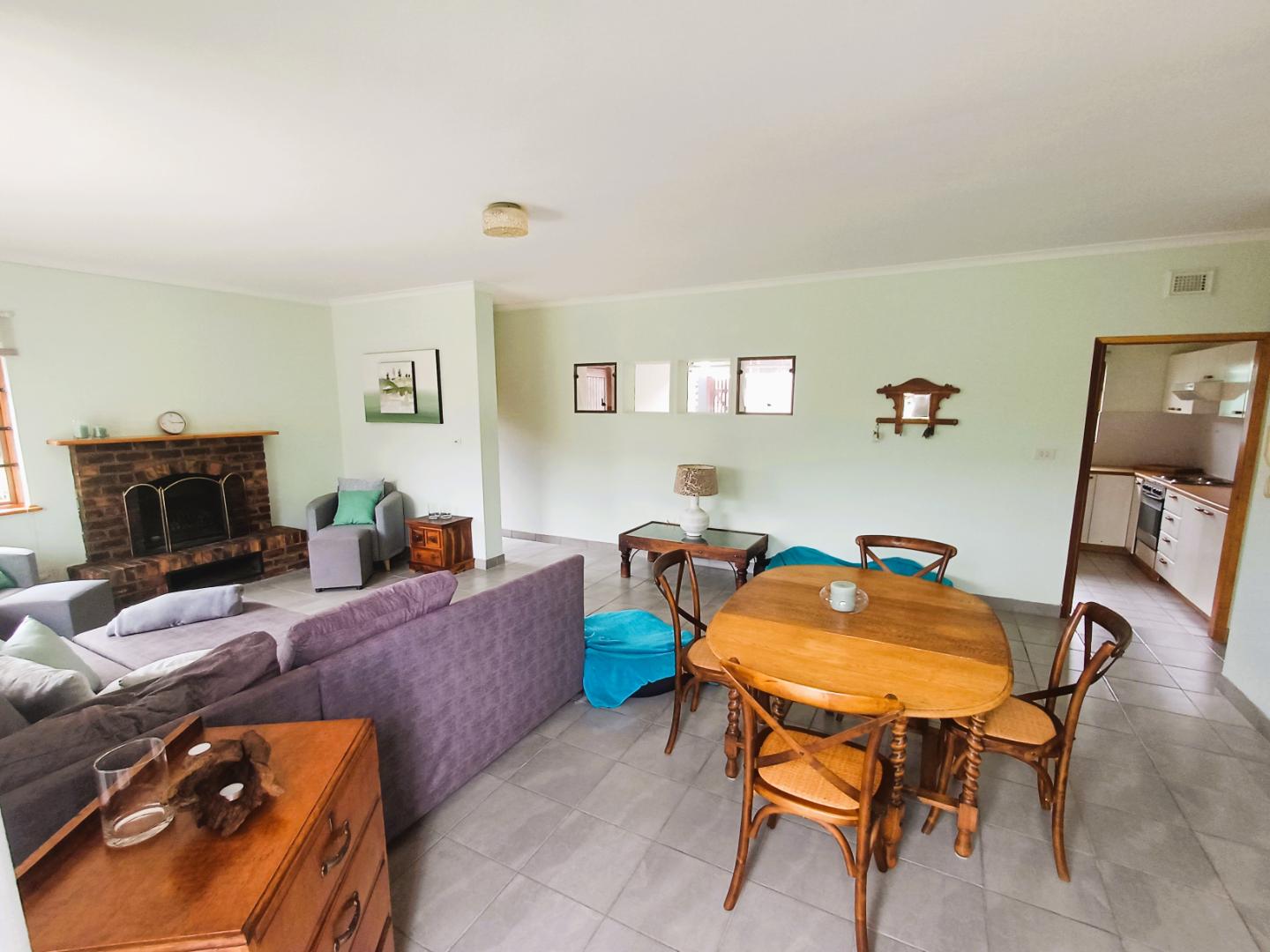 The open-plan living area merges dining and lounge spaces, flowing onto a patio via cottage pane sliding doors, surrounded by greenery for al fresco dining, and warmed by a wood-burning fireplace.
