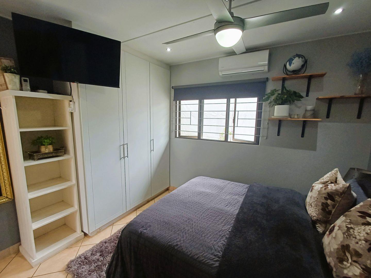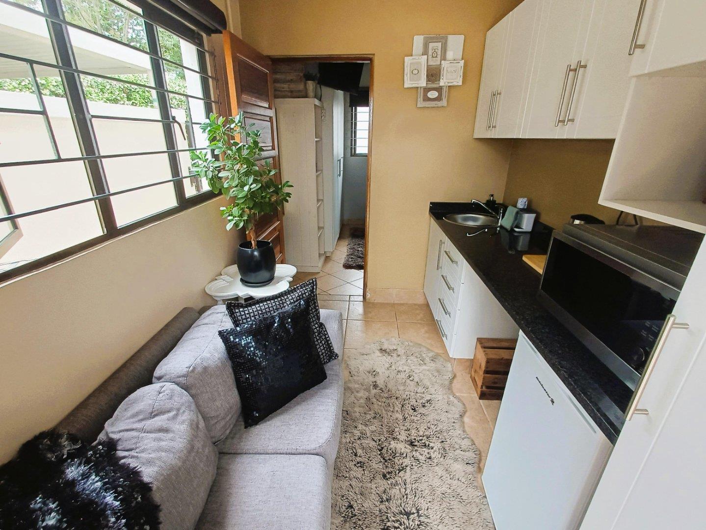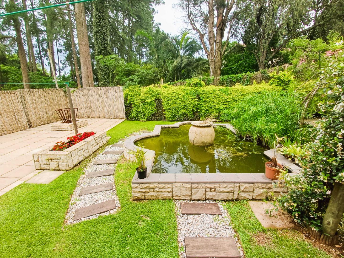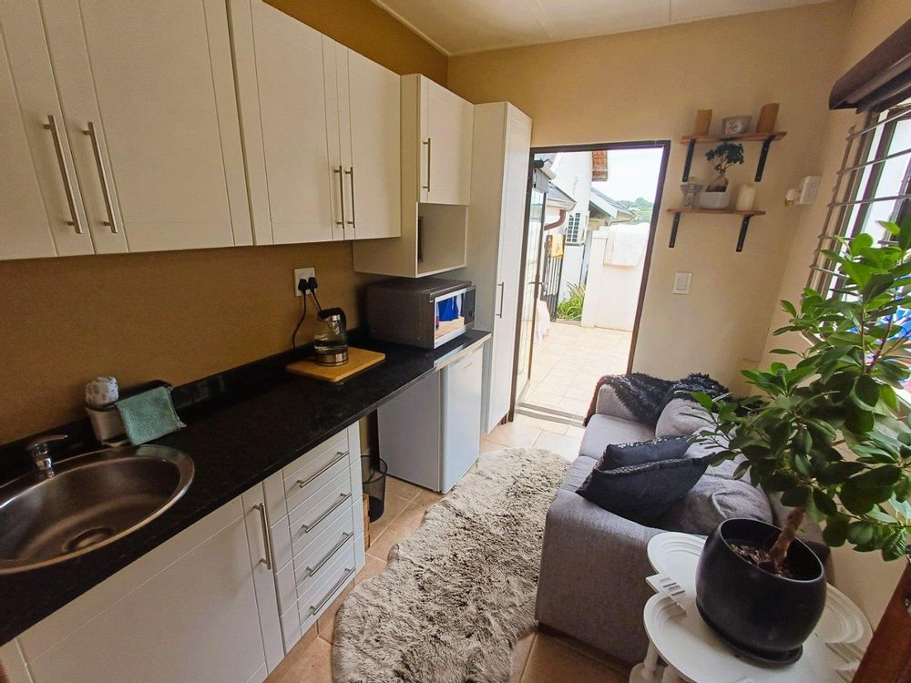 At the rear of the property, a courtyard serves for laundry drying, accompanied by a private area with fish pond and space for bonfires or braais. This section also includes a compact flatlet suitable for guests or extended family, offering an open-plan kitchenette and lounge, a bedroom, and an ensuite shower.