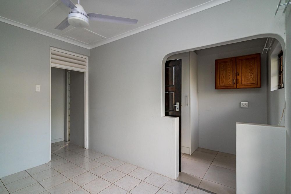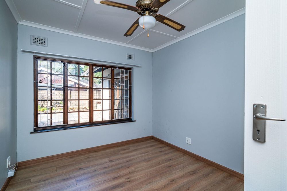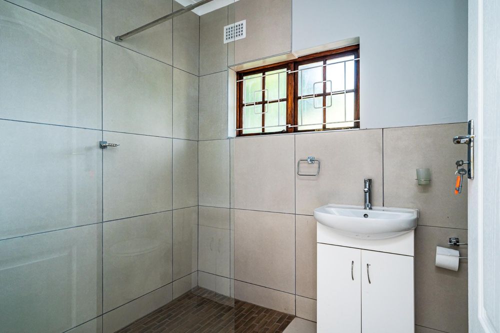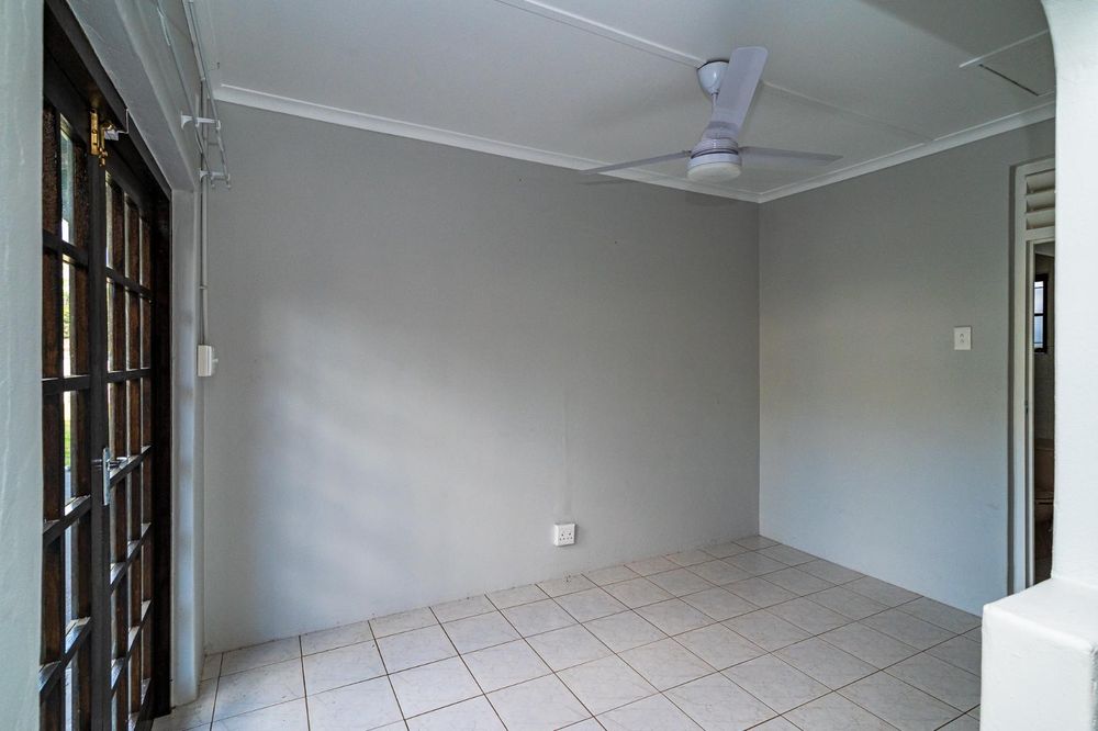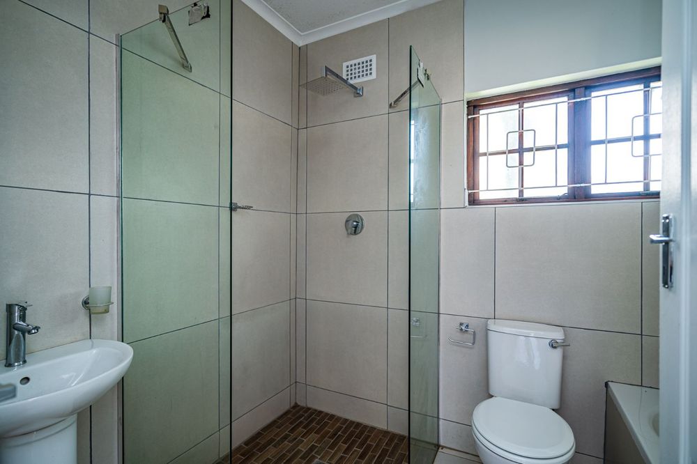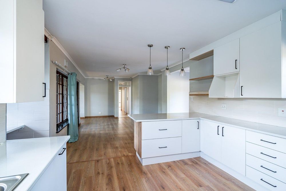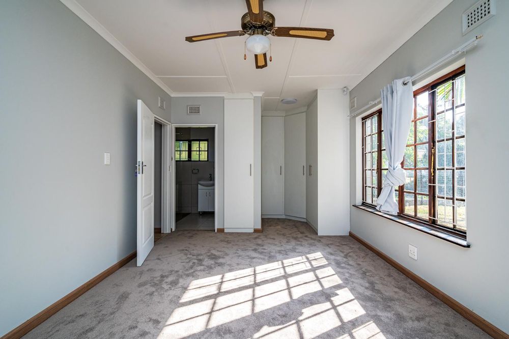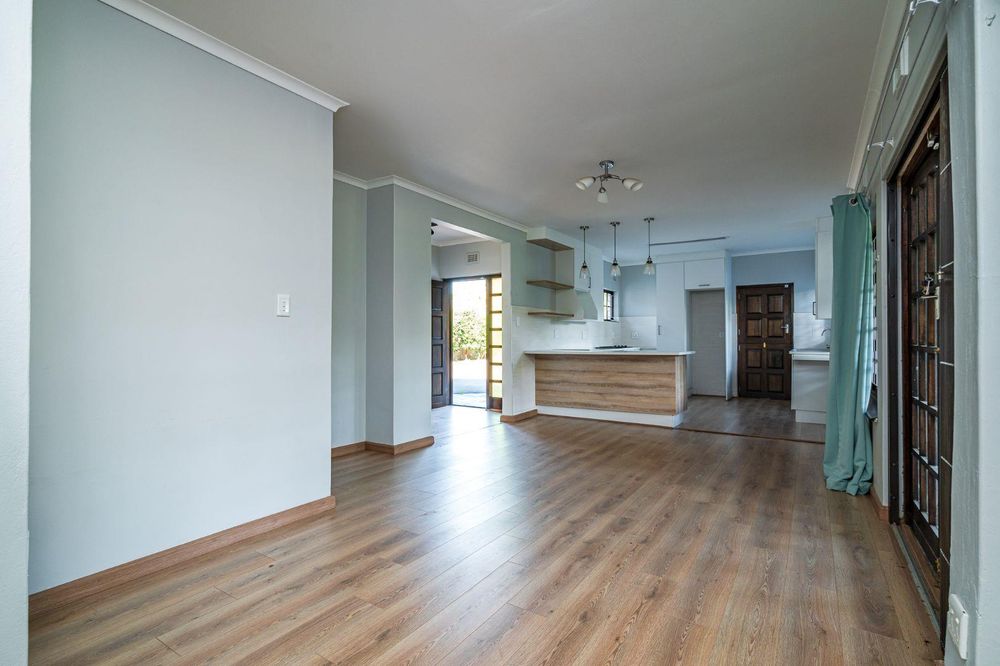 The massive open plan dining room and spectacular brand-new kitchen is a wonder to behold. The kitchen has a built-in hob and oven, beautiful white granite tops and plenty of cupboard space. The back door in the kitchen leads to the courtyard with its domestic ablution. A laundry as well as the back entrance to the bachelor pad or a guest room, this room can also be extended into a large garden cottage which can also generate and additional income. The dining area can easily accommodate an 8- or 10-seater table and chairs and has a small recess perfect for a home office. The dining area had double French doors opening up to a small private covered patio area with a pizza oven and an awning. This area is perfect for El Fresco dining. Two spacious bedrooms, both with views of the pool area and ample cupboards. The guest bathroom has both a tub and a large walk-in shower. The master bedroom has a cupboard alcove, en-suite bathroom with a shower and double French doors leading to the pool area and back garden.