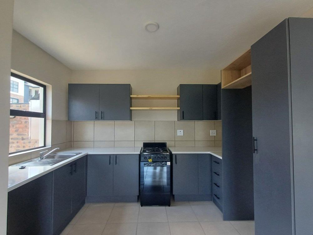 Discover a premier 3-bedroom freestanding home in Kings Gate Estate. These cleverly designed residences optimize space and light, boasting an open-plan living area that effortlessly connects to a private covered veranda, ideal for relaxation or hosting. The contemporary kitchen features a stylish breakfast nook, gas hob, and electric oven. Upstairs, three bright bedrooms with built-in cupboards bask in natural light. The main bedroom includes an en-suite shower and a separate built-in cupboard area. A separate family bathroom serves the rest of the household.