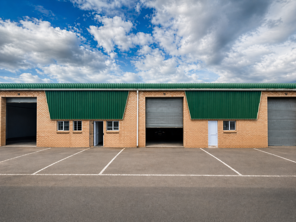 The property is positioned within an established industrial park and offers clearly marked parking/loading space in front of the unit. The exterior is neat and presentable, with easy access to the unit and a clean business-park environment.