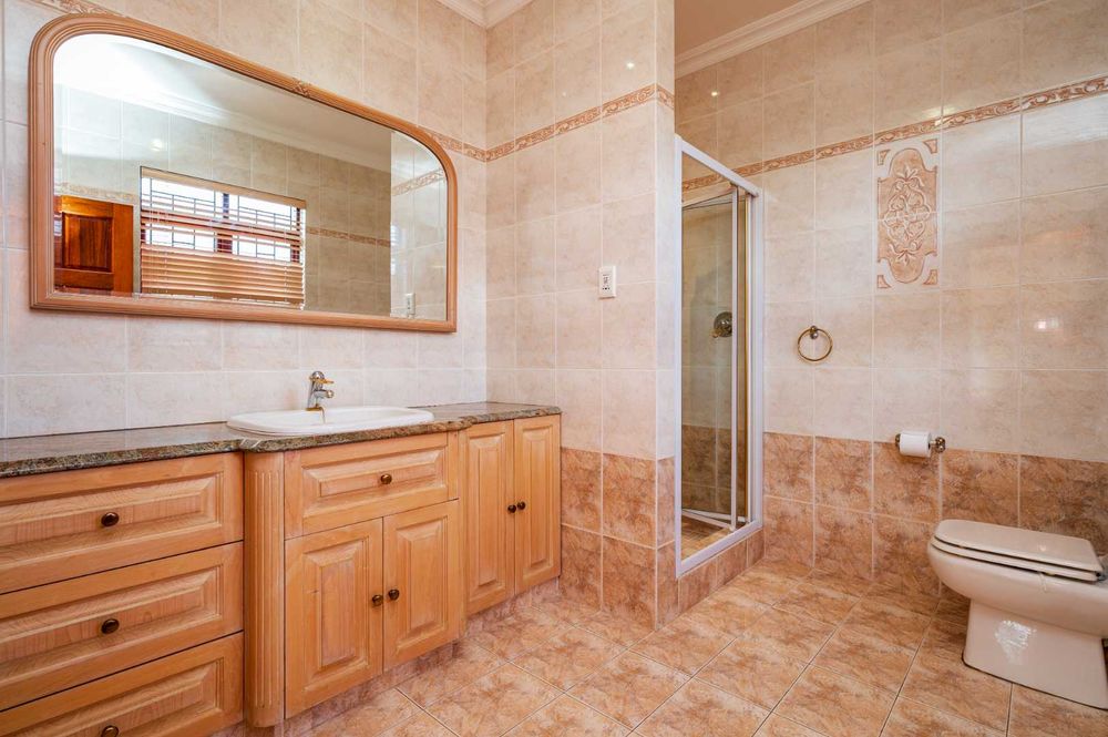 The gourmet kitchen, positioned just off the family lounge, is fitted with granite countertops, solid wood cabinetry, and a breakfast bar. It is fully equipped with an eye-level oven, gas hob, extractor fan, built-in fridge, wine rack, prep bowl, and pantry cupboard—everything a seasoned chef could ask for. A separate scullery/laundry adds further convenience for a well-run household.