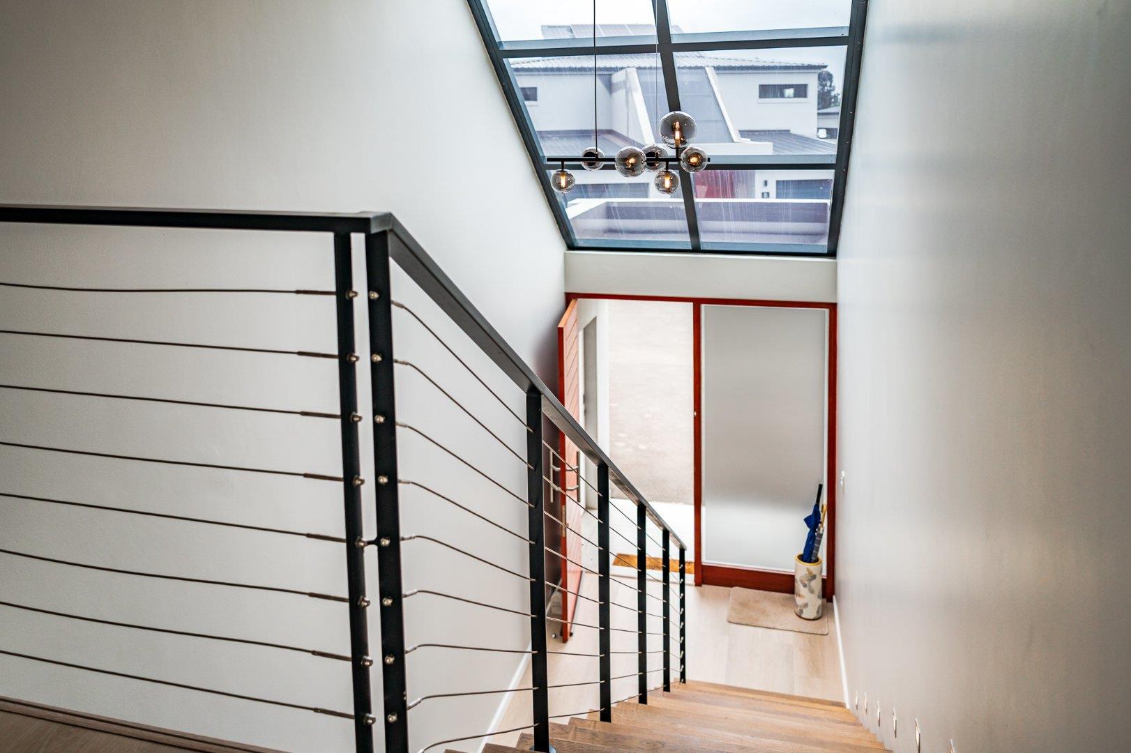 As you approach, the exterior design of the double garages captivates, with the main entrance door set in the middle, leading you to an enchanting entrance hall. Bathed in natural light from a skylight, this space sets the tone for the home's bright and airy ambiance. A glance to your left reveals a staircase leading to the bedrooms, while to the right, a mini hallway unfolds, guiding you to the guest bathroom with contemporary finishes and an adjacent office.