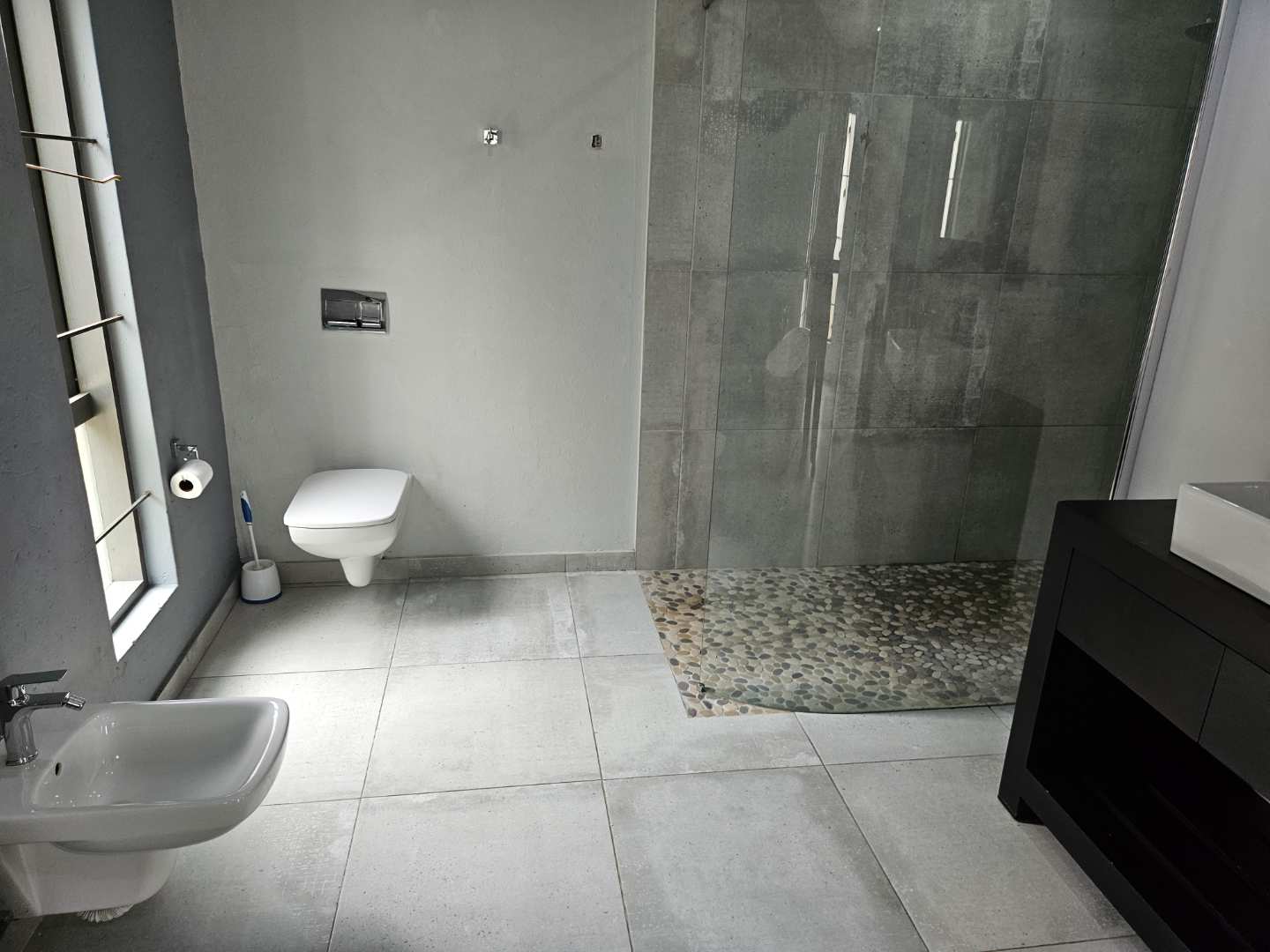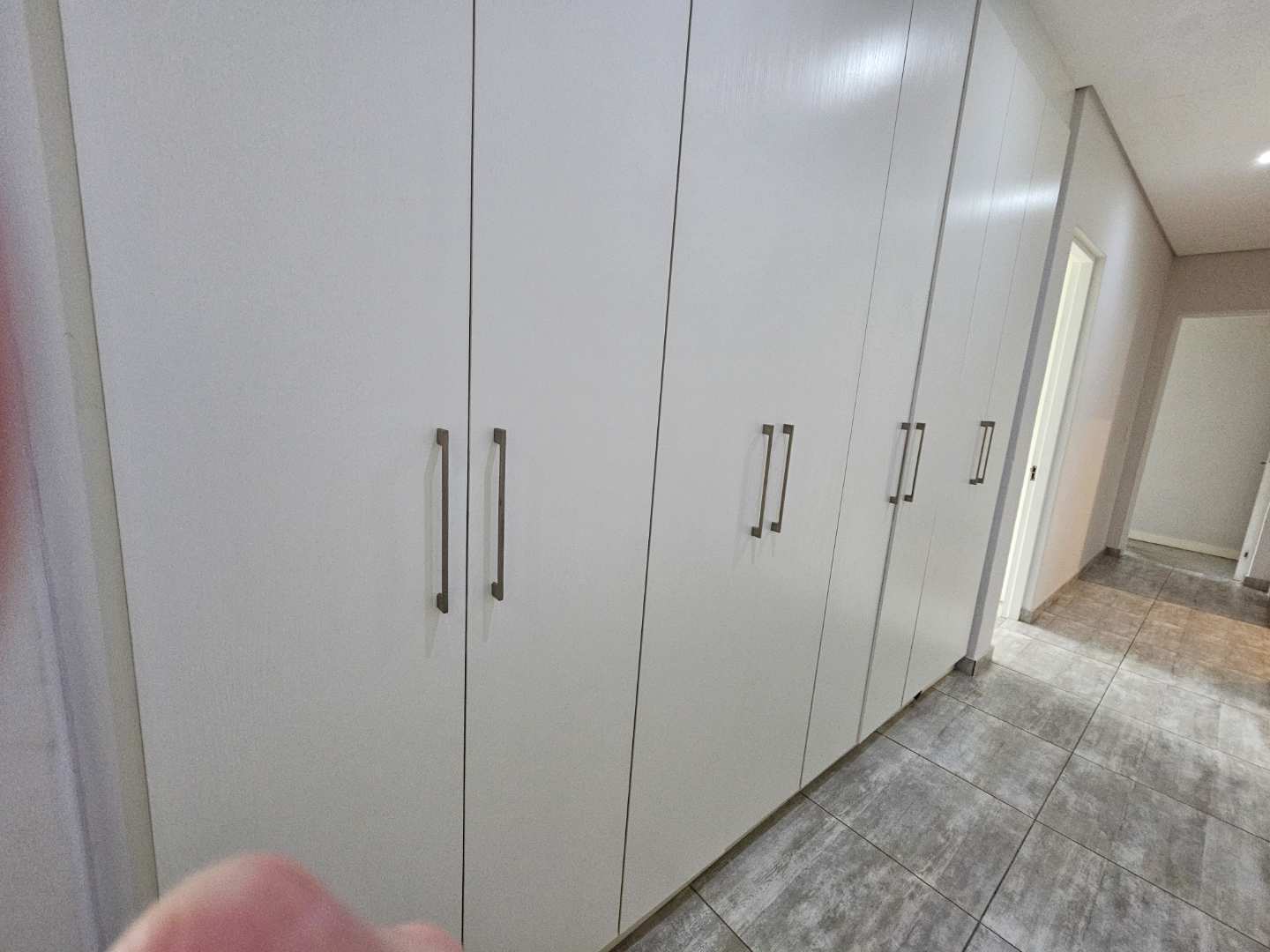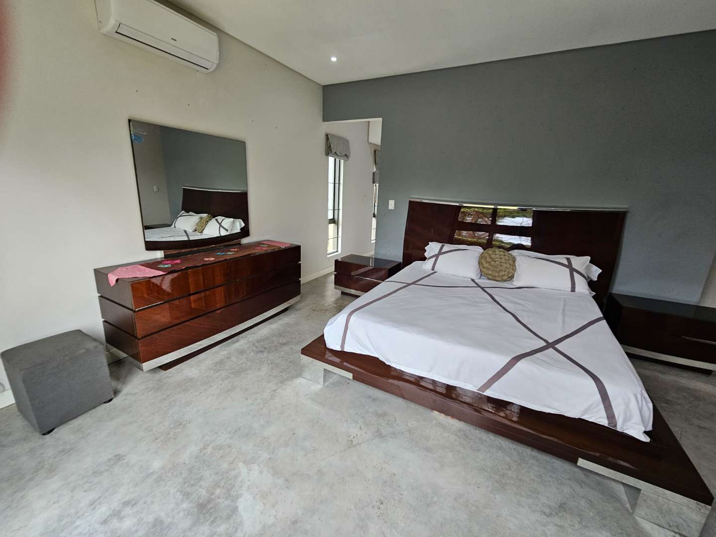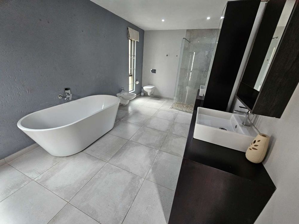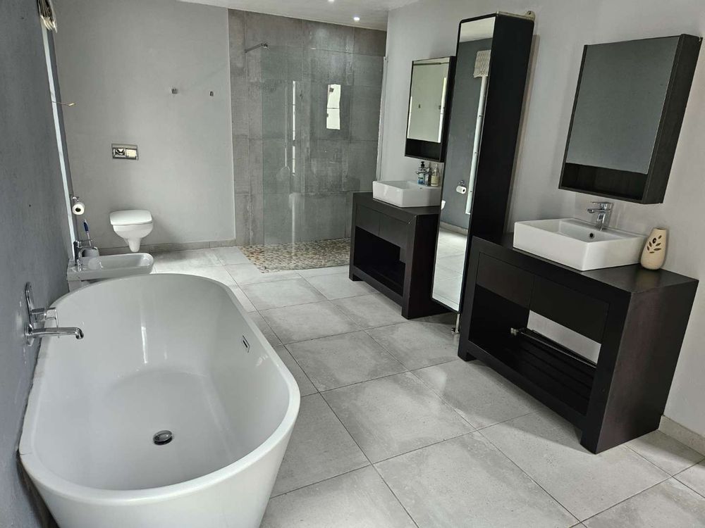 This newly built stunning, modern and open plan home is ready to move in, relax and enjoy. No work needs to be done. It offers 4 airconditioned bedrooms with built in cupboards and en-suites. The main bedroom has a full en-suite with two wash basins, shower, bath and dressing room.