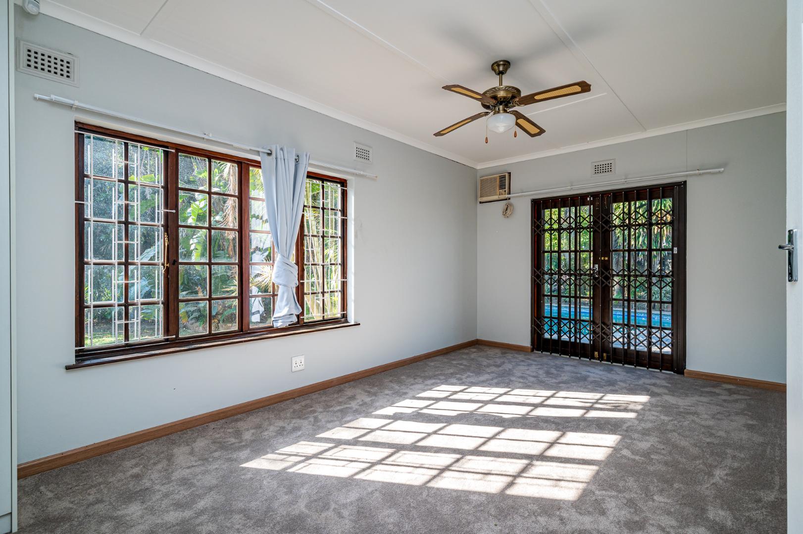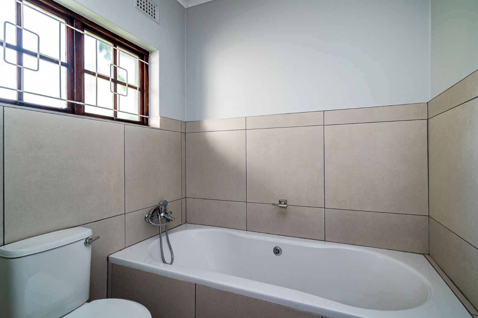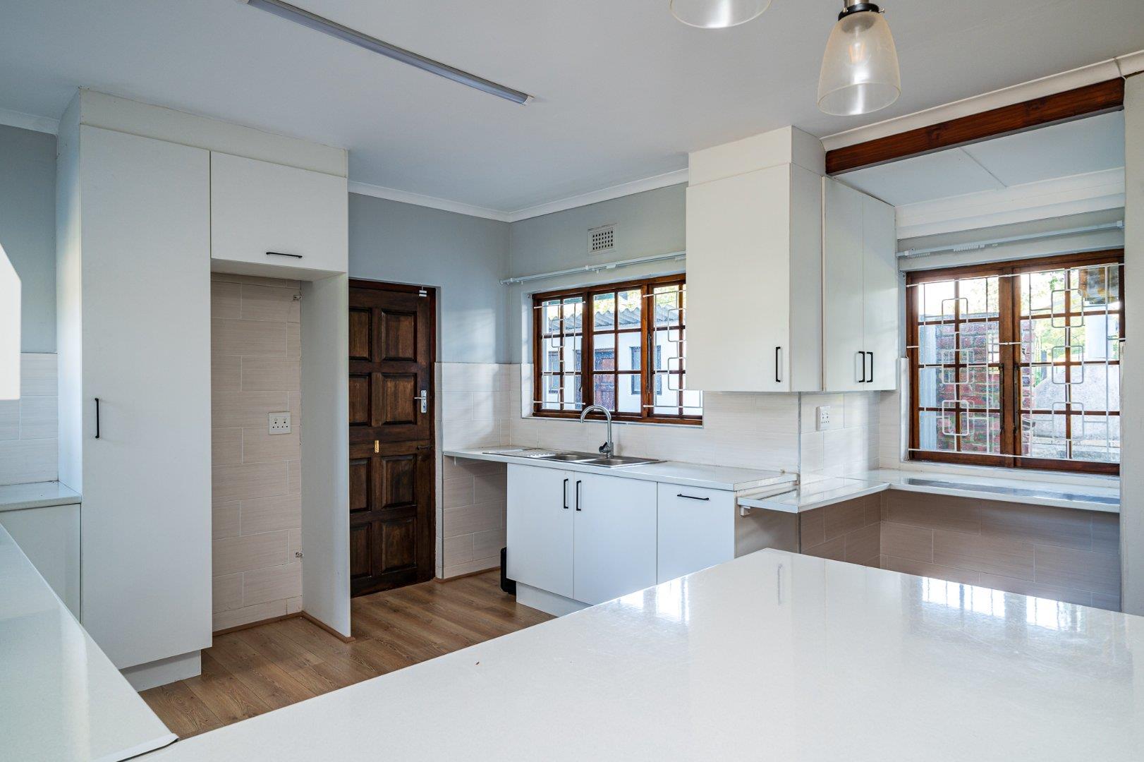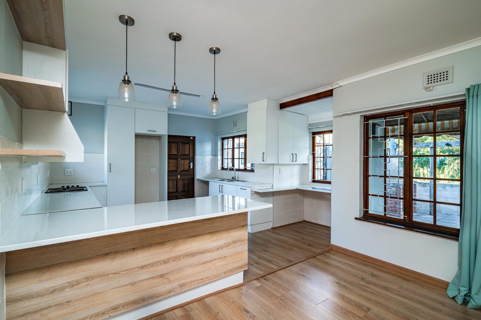 The massive open plan dining room and spectacular brand-new kitchen is a wonder to behold. The kitchen has a built-in hob and oven, beautiful white granite tops and plenty of cupboard space. The back door in the kitchen leads to the courtyard with its domestic ablution. A laundry as well as the back entrance to the bachelor pad or a guest room, this room can also be extended into a large garden cottage which can also generate and additional income. The dining area can easily accommodate an 8- or 10-seater table and chairs and has a small recess perfect for a home office. The dining area had double French doors opening up to a small private covered patio area with a pizza oven and an awning. This area is perfect for El Fresco dining. Two spacious bedrooms, both with views of the pool area and ample cupboards. The guest bathroom has both a tub and a large walk-in shower. The master bedroom has a cupboard alcove, en-suite bathroom with a shower and double French doors leading to the pool area and back garden.