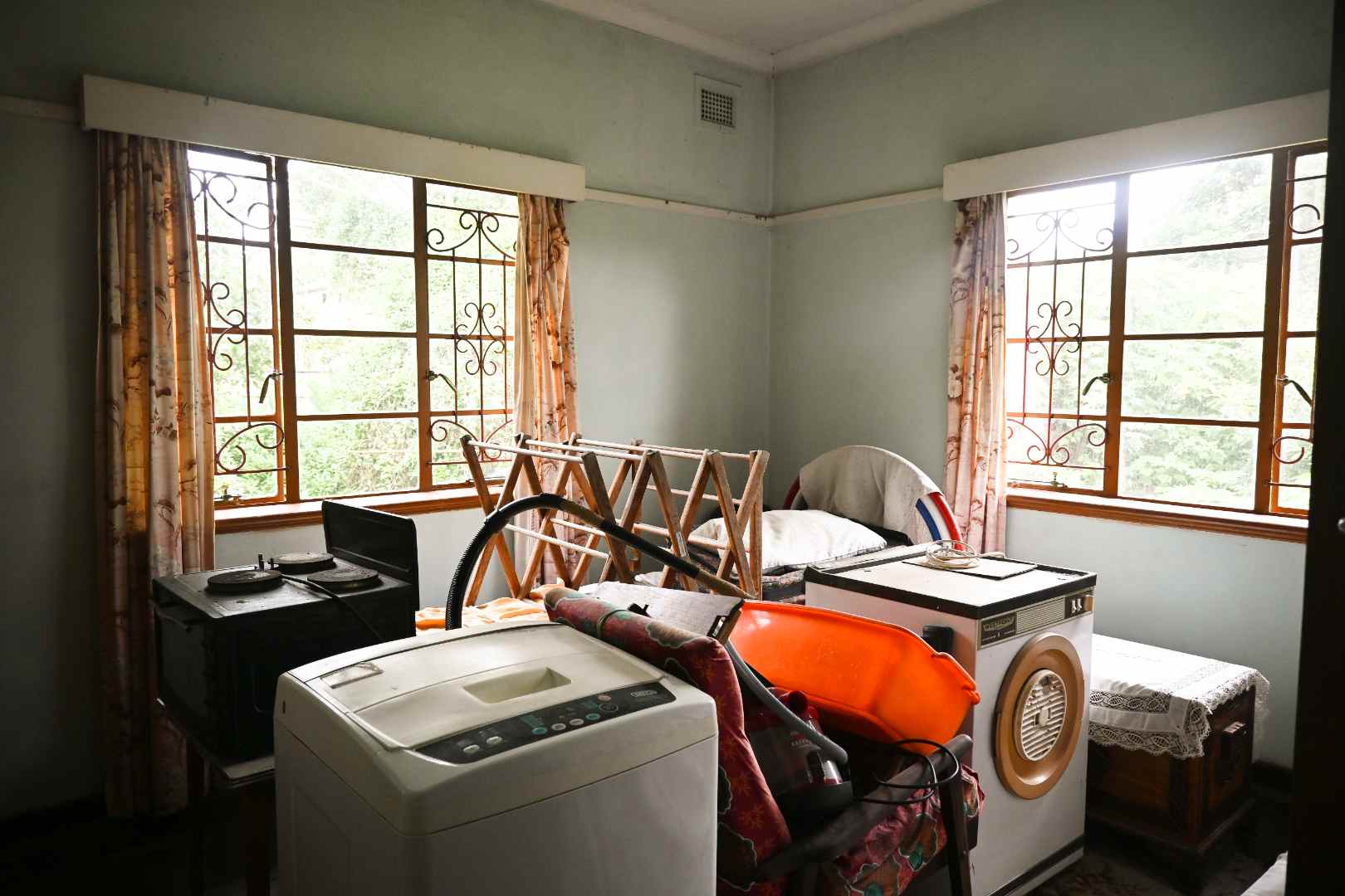 The garden is overgrown and unkempt, but the sharp eye finds partitioned garden beds, slate pathways, beautiful Azalias and additional lawn space. The boundaries are fenced, and forgotten. Entrance through an electric gate needing restoration.
