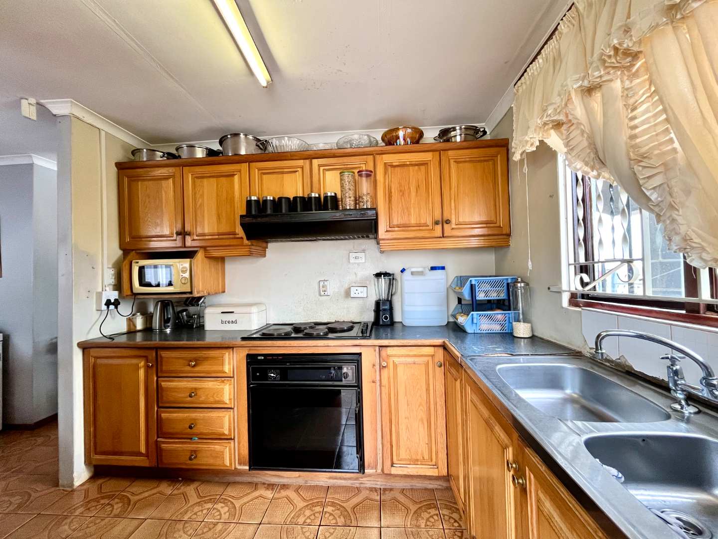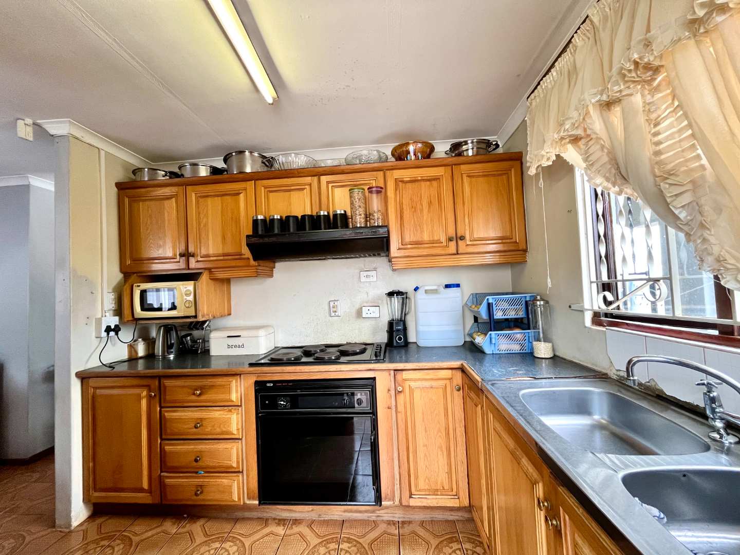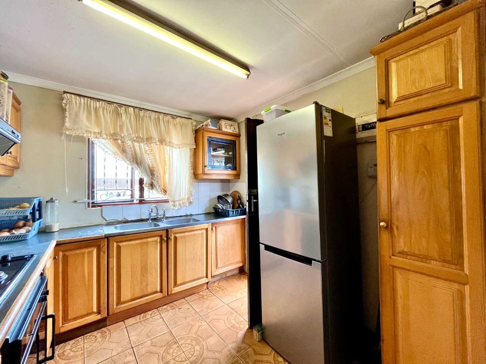 Inside, the home opens into a spacious lounge and dining area, flowing into a well-designed kitchen featuring ample cupboard space, a double sink, electric stove and oven, and an extractor fan.