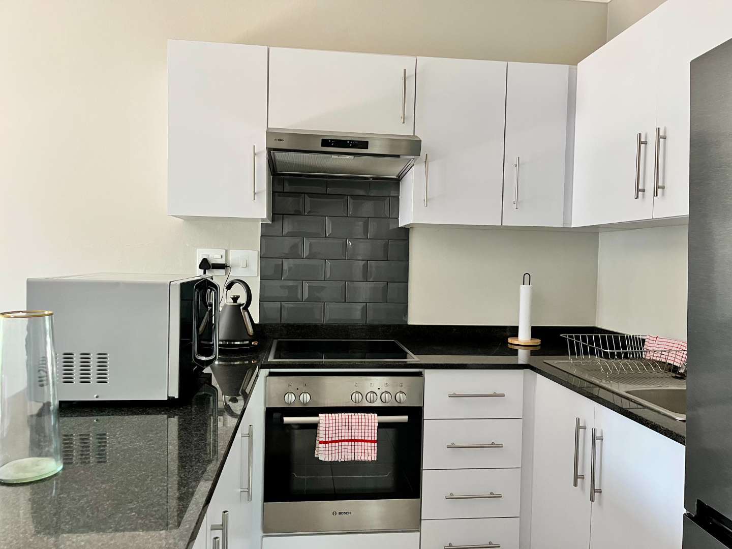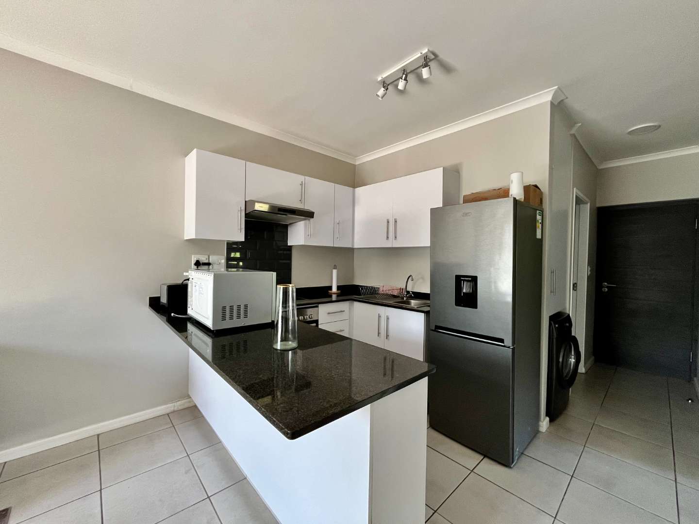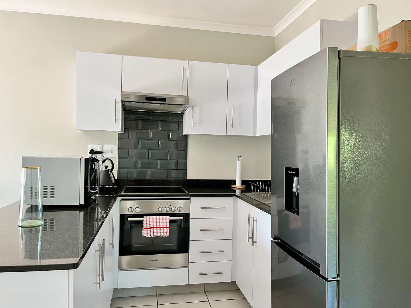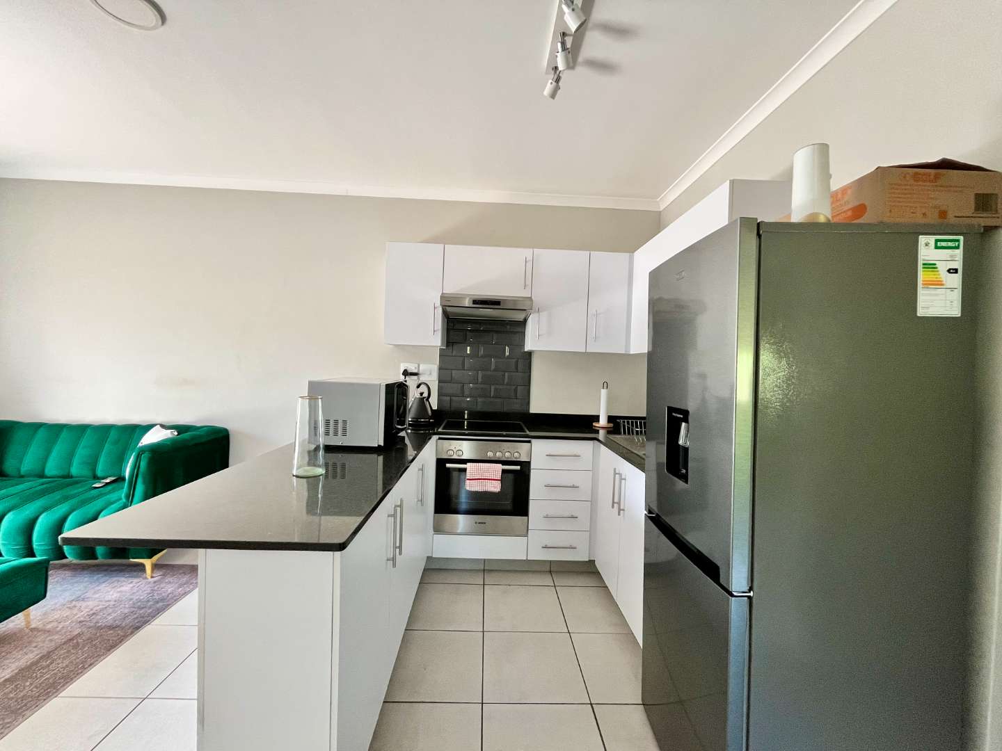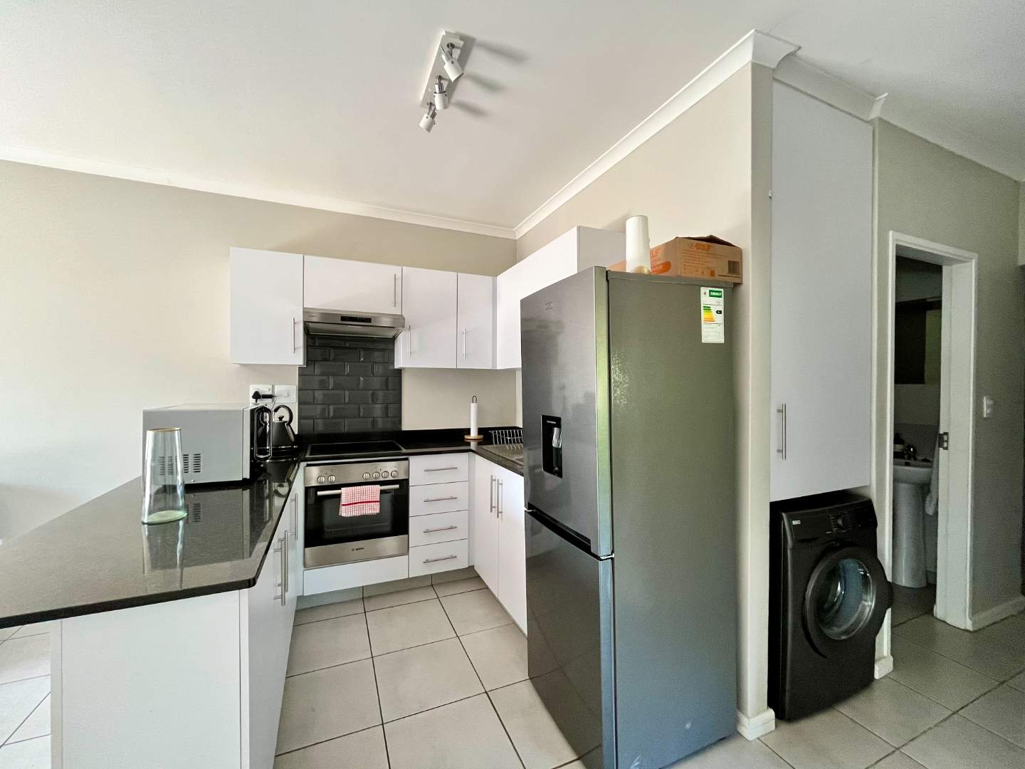 * Modern kitchen with BIC, stove, oven, and space for fridge and washing machine